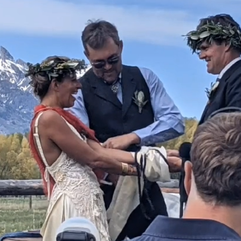 The Ceremony was so beaufiul and unique, and Allegra looked absolutely stunnin in her beautiful western-lace wedding dress, red scarf and cowboy boots! Miller also looked very handsome with a nice western flair- a bolo tie! At the end of the ceremony, as they walked away as Newlyweds, the crowd released live butterflys to symbolize their blooming love.